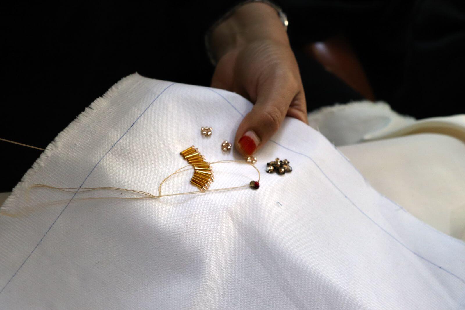 One of the project's trainees practicing beading techniques